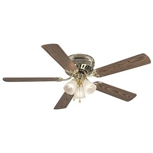 Product Description : From the ManufacturerThe Bermuda 52-Inch Flush Mount Ceiling Fan has two fan blade colors. The 4-blades are reversible and are Oak or Walnut. The fan uses 3 60-Watt Bulbs and has 3 frosted glass lights. Product Description : Finish:Bright Brass, Blade Finish:Oak/Walnut, Light Bulb:(3)60w G16 Cand F Incand 52'' flush mount fan with 5 reversible blades. 3-speed pull chain control. Reversible air flow for all year comfort. 3-light frosted glass light kit included. Cap included to install with or without light. Limited lifetime warranty. Energy information at high speed: Airflow:4950 CFM Electricity Use: 50 watts Airflow Efficiency: 99 CFM/watt Compare: 36 to 48 ceiling fans have airflow efficiencies ranging from approximately 71 to 86 cubic feet per minute per watt at high speed. 49 to 60 ceiling fans have airflow efficiencies ranging from approximately 51 to 176 cubic feet per minute per watt at high speed. Money-Saving Tip: Turn the fan off when leaving room.